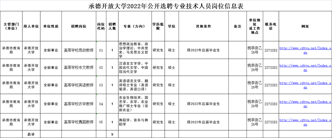 选聘岗位5个。具体选聘岗位、选聘人数、选聘条件等详见《承德开放大学2022年公开选聘专业技术人员岗位信息表》。