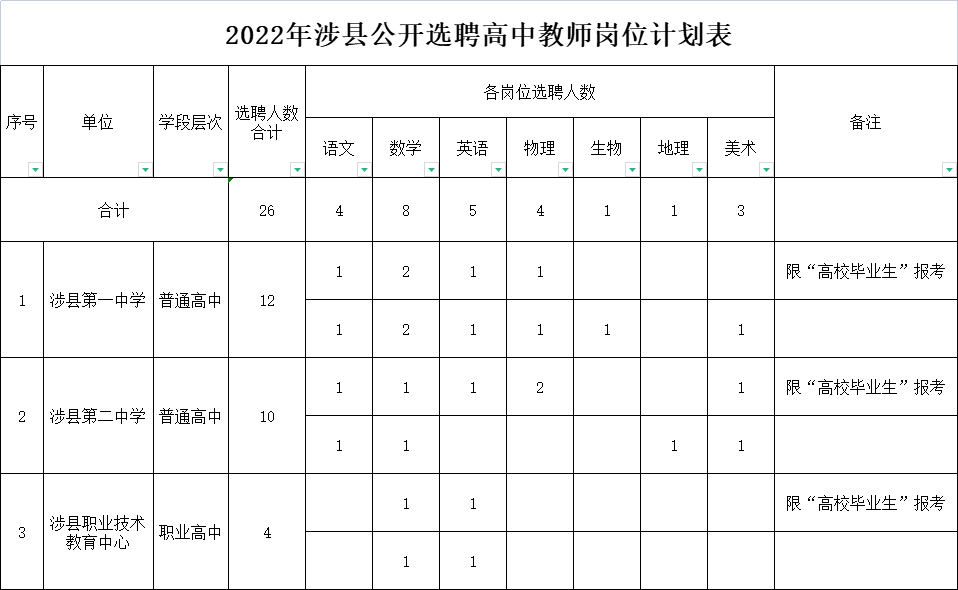 本次选聘高中教师共26名,部分岗位限高校毕业生报考,其中限高校毕业生报考岗位13名。