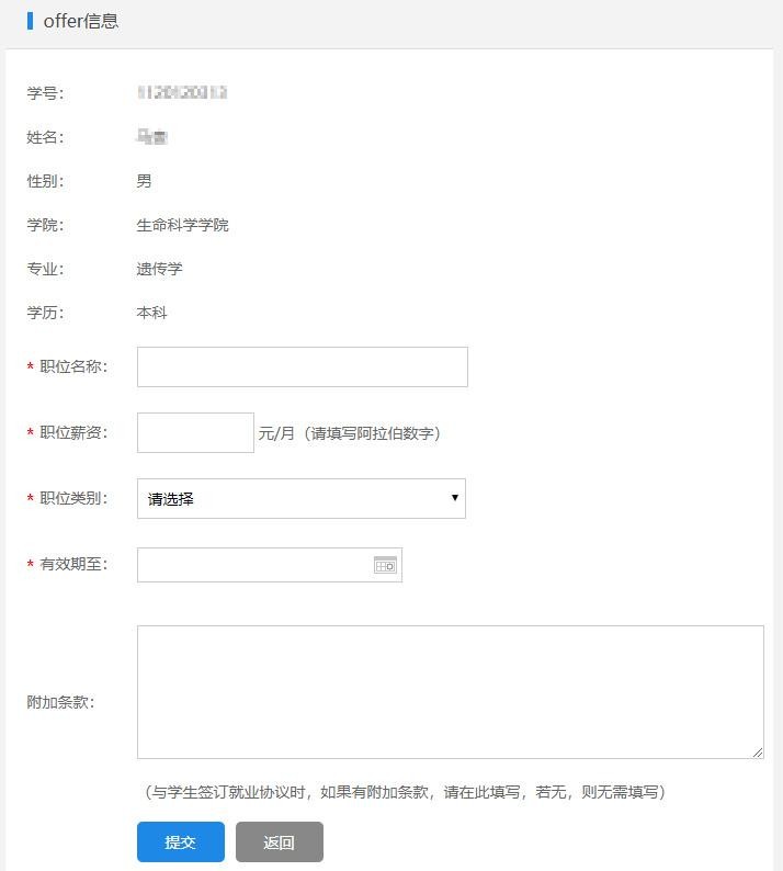 点击提交按钮,如果搜索到该学生,则会显示如下图所示页面,填写 offer