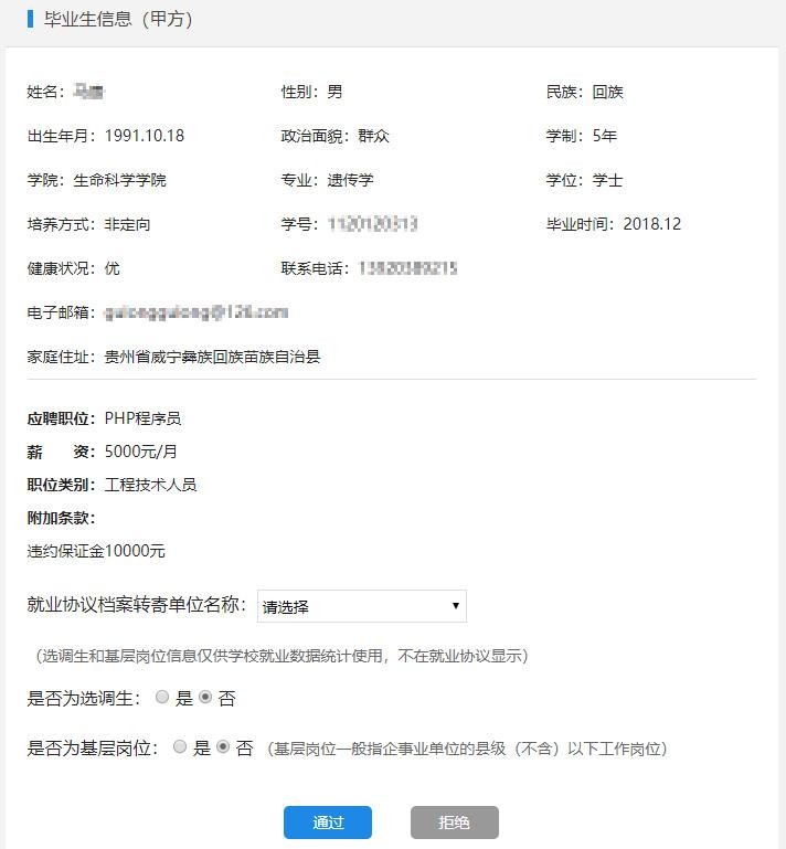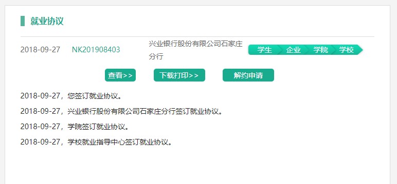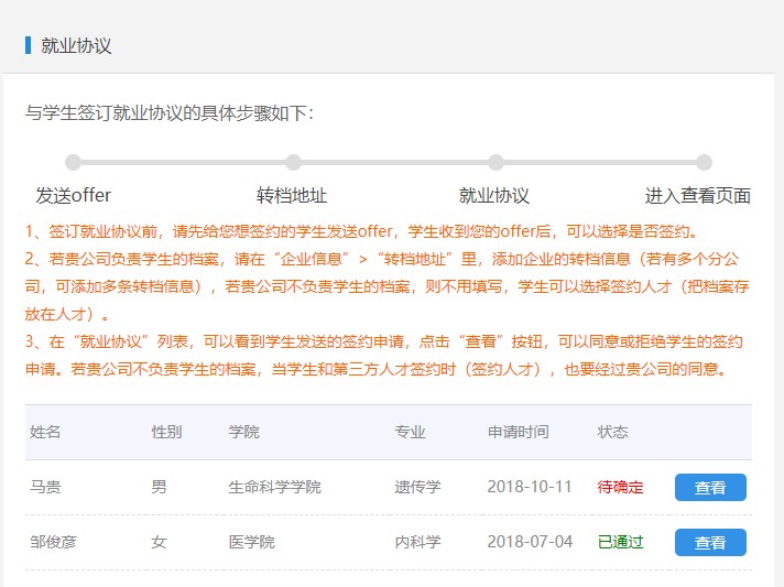 状态:状态为学生提交申请的状态,点击右侧“查看”按钮,可以查看此申请者的详细信息,以及对于这位申请者的就业协议通过或拒绝。企业通过后,此就业协议转向学院及学校,等待学院及学校的审批通过。如下图: