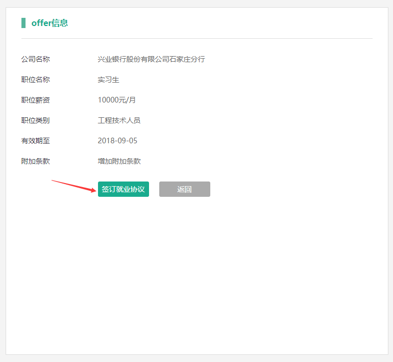 如果此学生还未签订就业协议,则会显示签订就业协议按钮,点击即与此企业签订就业协议;