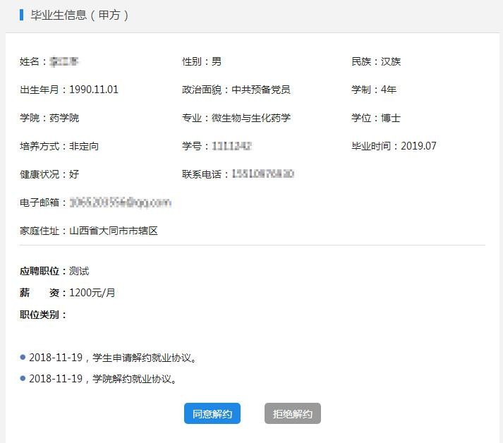 企业进入就业协议列表,点击查看需要解约的就业协议,可以同意/拒绝学生