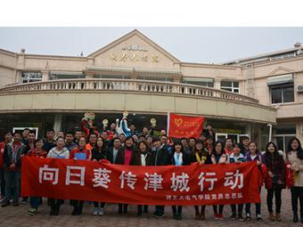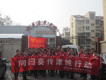 爱心传津城,向日葵在行动。志愿服务队走访慰问了和平区鹤寿养老院、红桥区桃花源等多家养老院,和老人建立了深厚的友谊,奉献爱心的同时,也收获了感动和成长。每次活动都精心的准备,筹划了和养老院环境相对应的节目,凝聚着所有人共同的爱心;或发挥所长,帮助维修小家电、小电器;或耐心细致,陪老人倾心交谈;或清洁卫生,美化老人生活的环境;或将事先编排的节目热情呈现,博得老人们的阵阵掌声。“向日葵•传津城”,传的是爱,暖的是心,收获的是感恩和纯真。大学生的关爱之心由此传递,孤独老人的心得到抚慰,大学生与老人脸上的笑容代表着一份幸福和大爱。