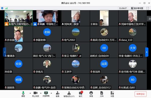 2020年5月5日下午,402永利集团官网入口召开“河工大电气校友同心同向同行”(线上)交流会,学院领导班子全体成员及来自企业、学界的150余位优秀校友列席。此次会议得到中国电工技术学会大力支持,经过前期多方筹备邀约,在此疫情特殊时期通过线上形式召开。省部共建国家重点实验室副主任李永建教授主持此次线上交流会。