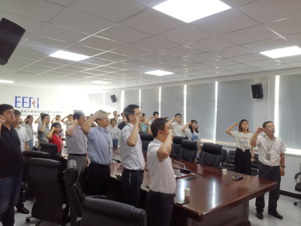 观看直播结束后,在于明同志的带领下,会议全体师生共同起立,举起右手宣誓重温入党誓词。