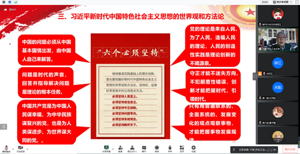 习近平新时代中国特色社会主义思想的世界观与方法论,坚持和发展马克思主义,同中国具体实际相结合,于明书记为大家解读了二十大报告中天下为公、民为邦本的重要内涵,其中蕴含丰富的治国理政思想智慧,同科学社会主义价值观主张具有高度契合性,还为同学们讲解了“六个必须坚持”的内涵和重要意义,中国式现代化的中国特色,以及前进道路上必须牢牢把握的重大原则,推进文化自信自强的重要意义。对党和国家事业在社会主义经济、政治、文化、生态建设方面,以及国防和军队建设、外交工作等方面的重大部署,以伟大自我革命引领伟大社会革命,落实新时代党的建设总要求。