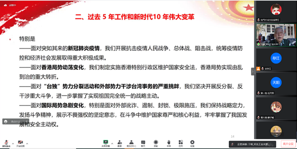 于明书记为同学们讲解了过去极不寻常、极不平凡的五年,党带领人民攻克了许多长期没有解决的难题,办成了许多事关长远的大事,特别分析了面对突如其来的肺炎疫情,面对香港局势动荡变化,面对台独势力分裂活动和外部势力挑衅、国际局势急剧变化等难题,我们党采取的措施与取得的成效,从二十大报告中解读并见证我们的非凡十年。
