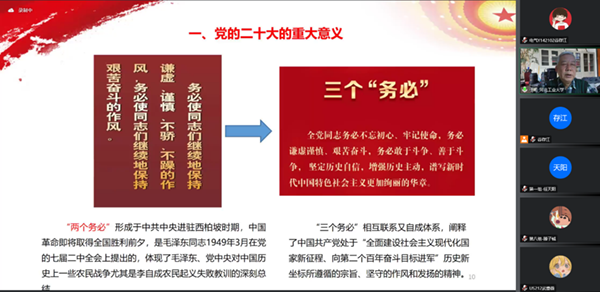 中国共产党第二十次全国代表大会是在全党全国各族人民迈上全面建设社会主义现代化国家征程,向第二个百年奋斗目标进军的关键时刻召开的一次十分重要的大会。于明书记首先为同学们分析了大会主题,大会主题高屋建瓴、旗帜鲜明,明确宣示了中国共产党和中国人民在全面建设社会主义现代化国家新征程上举什么旗,走什么路,以什么样的精神状态,朝什么样的目标继续前进。“三个务必”相互联系又自成体系,阐释了中国共产党处于全面建设社会主义现代化国家新征程,向第二个百年目标进军历史新坐标所遵循的宗旨、坚守的作风和发扬的精神。