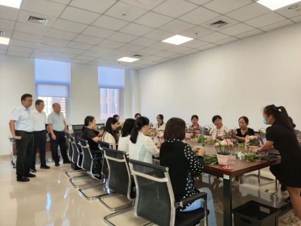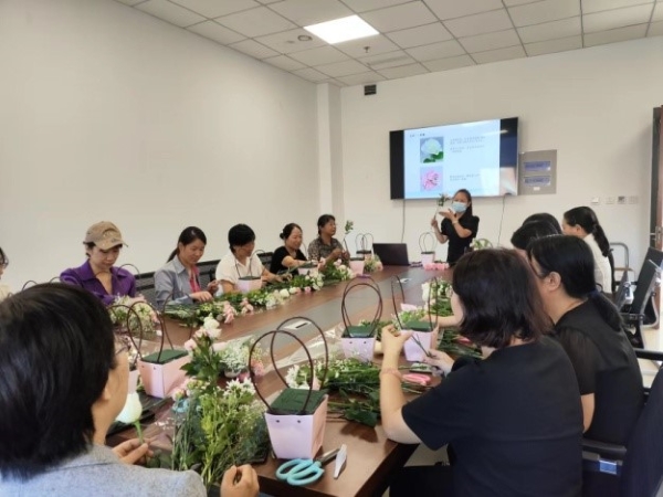 在插画活动室,学院工会精心准备了花泥、花篮和插花工具,以及玫瑰、康乃馨等花材。在花艺师的精心指导下,老师们修剪、整枝、装饰,用灵巧的双手编制出一束束创意十足的花艺作品。