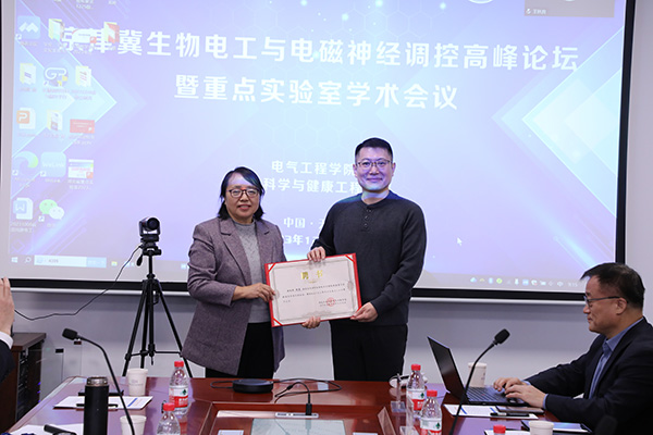 402永利集团官网入口科研院副院长姚爽、省部共建电工装备可靠性与智能化国家重点实验室副主任张献教授分别代表学校、学院致欢迎辞,对各位专家的莅临表示欢迎。聘任仪式环节,徐桂芝教授为天津市生物电工与智能健康重点实验室学术委员会主任委员天津大学明东教授颁发聘书。